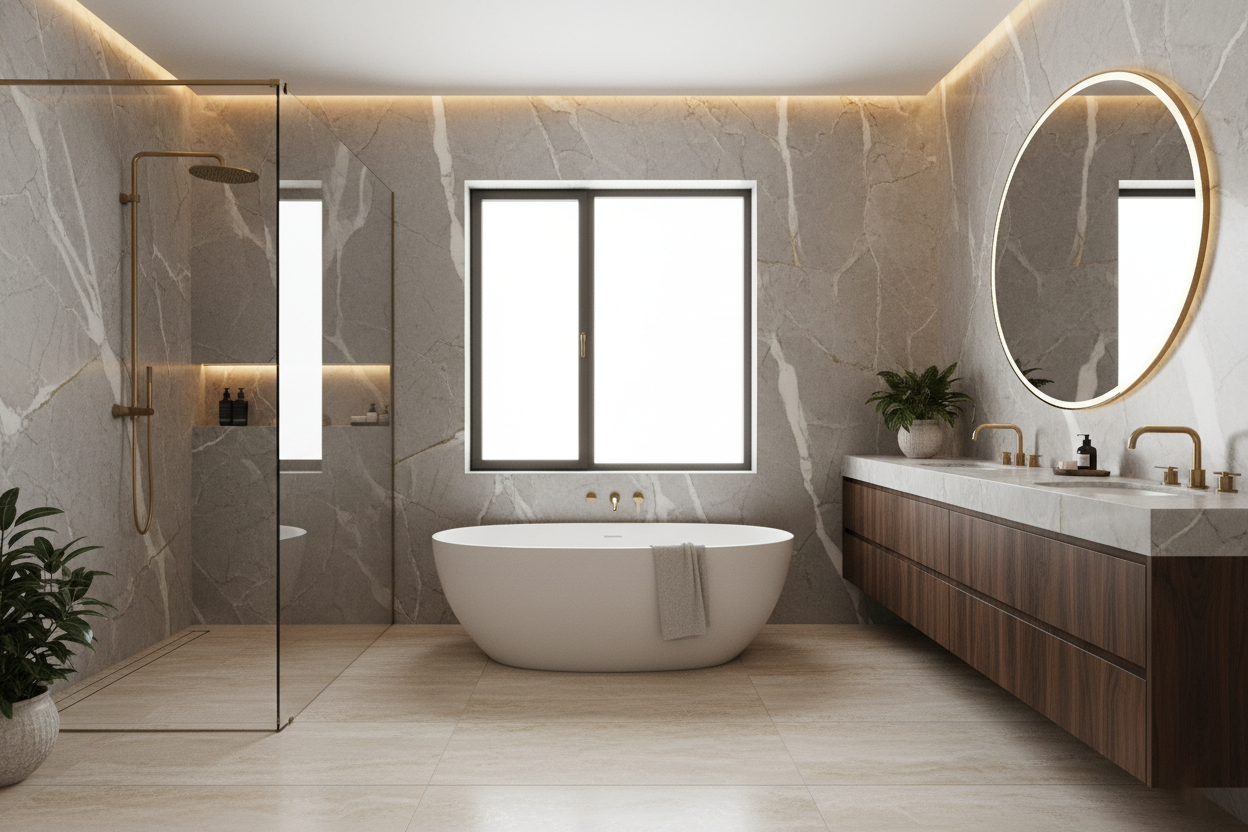 What about textures shall we discuss? Once you’ve decided on the texture of a layout, all the pictures should flow. When creating a luxurious feel in a Bathroom, it comes down to the way of choosing the right tiles and fixtures for your bathroom, and the golden trend for 2026 is tactile, earthy warmth.